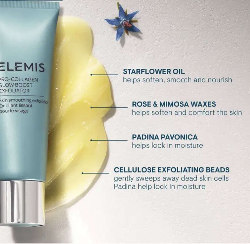 ELEMIS Pro Collagen Glow Boost Exfoliator – 60102 – Exfoliators – Benefits: Exfoliates, Hydrates, Softens This glow-boosting exfoliator shares the same blend of nourishing oils and waxes as our best selling Pro-Collagen Cleansing Balm, as well as its much